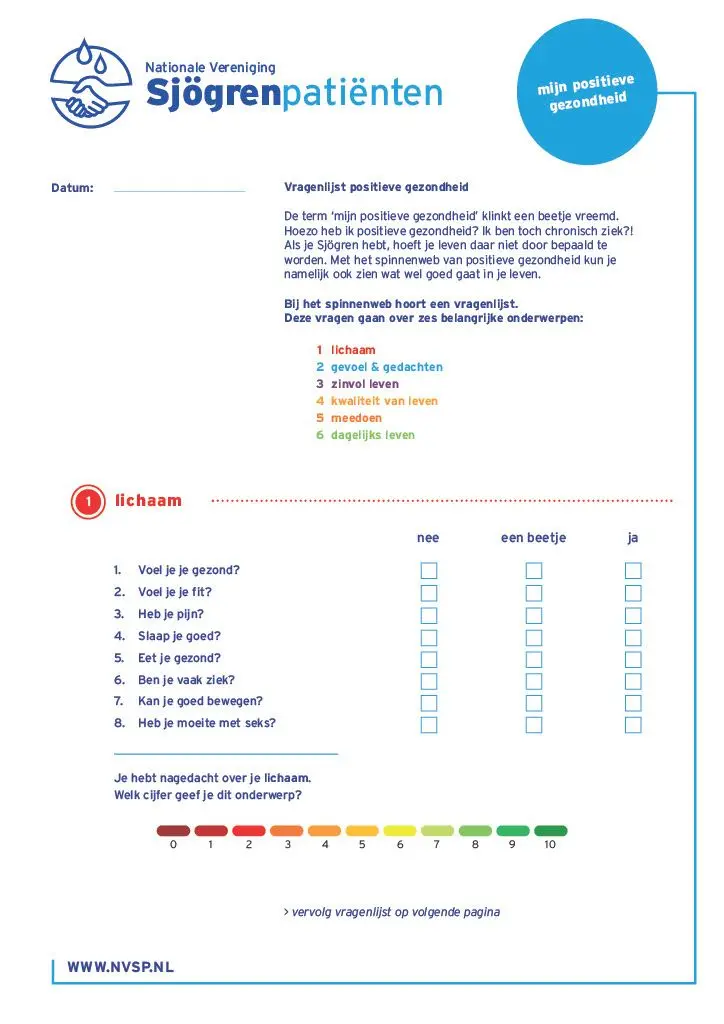 De Sjögren Gezondheidsscan bevat een vragenlijst die je helpt inzicht te krijgen in zes belangrijke onderwerpen van je leven: